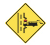 - Indicates an upcoming fire truck entrance on the right and vehicles should be aware of fire trucks entering the roadway.