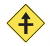 - Intersection ahead. The arrow shows which direction of traffic has the right-of-way.