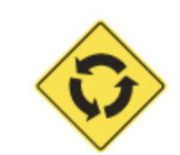 - Roundabout ahead. Reduce speed. The counter-clockwise arrows show the direction of vehicle traffic within the roundabout.